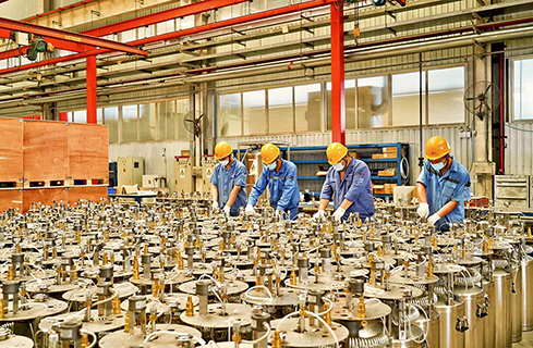 在天海工业明晖车间里,一派繁忙景象,工人师傅们正在对液氧呼吸器的零部件进行组装。据介绍,此呼吸器采用高真空多层绝热设计,与常规工业液氧气瓶相比,具有更好的绝热性能,液氧静态存储时间可达到30天以上。